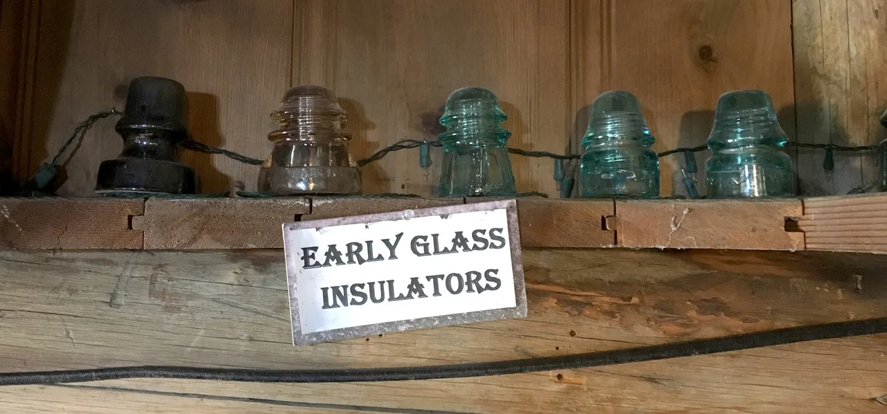 Nearly a week after returning to Mammoth Lakes, CA from our Bodie excursion, we attended the town’s Fourth of July parade, where we were treated to a Navy F-18 flyover, and all kinds of festooned vehicles, including one from the Mammoth Museum. Intrigued, the next day we decided to visit the historic Hayden Cabin. Located just a few blocks from the parade route on Old Mammoth Road, the rustic 1920s log cabin is situated in a picturesque spot right on the bank of Mammoth Creek. We walked around the grounds, and as we entered the cabin, my gaze was immediately drawn upwards. Lining the walls of the room was a collection of—yep, you guessed it— glass insulators. I introduced myself to docent Mary Canada and asked her about them. They aren’t sure how they came to be included as part of the exhibits, but it’s possible that the cabin owner was a collector, or they were found on the property or around town. We may never know, but it’s good to see insulators represented as part of Mammoth Lakes’ history! I told her all about the National Insulator Association.